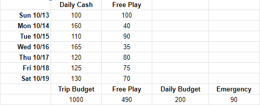 In the past I would divide the cash evenly for each day, and the free play would be an added bonus. But I got a distorted view of how each day went because I could have little to no freeplay on one day and a sizable amount another. This trip is no exception; a couple of the days I have closer to $40, and a couple of the days closer to $100.